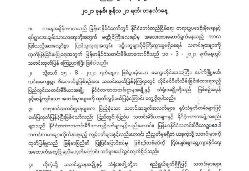 မကွေးတိုင်းဒေသကြီး၊ ပေါက်မြို့နယ်၊ ကင်းမကျေးရွာ မီးလောင်မှုဖြစ်စဉ်နှင့် ပတ်သက်၍ သတင်းမှားများအား ရည်ရွယ်ချက်ရှိရှိထုတ်ပြန်ခဲ့သည့် သတင်းဌာနအချို့နှင့် သံရုံးအချို့အား မြန်မာနိုင်ငံသတင်းမီဒီယာကောင်စီက ၂၁−၆−၂၀၂၁ ရက်နေ့တွင် ကြေညာချက်ထုတ်ပြန်၍ ပြင်းထန်စွာ ကန့်ကွက်ရှုတ်ချခဲ့သည်။
