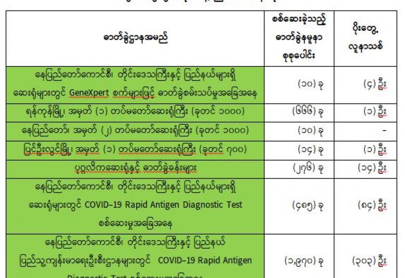 (၁၉-၆-၂၀၂၁) ရက်နေ့၊ ည (၈:၀၀) နာရီမှ (၂၀-၆-၂၀၂၁) ရက်နေ့၊ ည (၈:၀၀) နာရီအတွင်း ဓာတ်ခွဲနမူနာစုစုပေါင်း (၃,၄၃၁) ခုအား စစ်ဆေးပြီးစီးခဲ့ရာ COVID-19 ရောဂါ ဓာတ်ခွဲအတည်ပြု လူနာသစ် (၄၀၇) ဦး တွေ့ရှိရပါသည်။ သို့ဖြစ်ပါ၍ ယနေ့အထိ ဓာတ်ခွဲနမူနာ စုစုပေါင်း (၂,၆၇၄,၇၀၂) ခု အား စစ်ဆေးခဲ့ပြီး COVID-19 ဓာတ်ခွဲအတည်ပြုလူနာ စုစုပေါင်း (၁၄၈,၀၂၂) ဦး ရှိပြီ ဖြစ်ပါသည်။