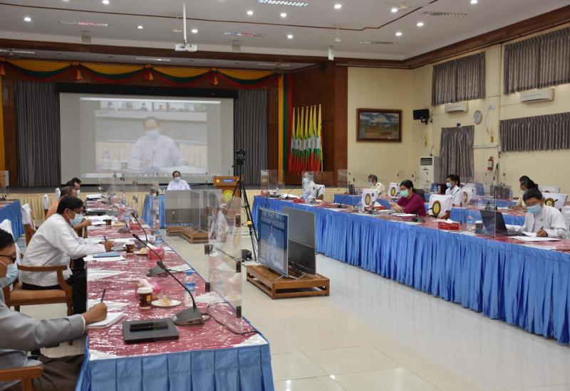 ကိုဗစ်-၁၉ ရောဂါ ကာကွယ်ထိန်းချုပ်ရေး လုပ်ငန်းညှိနှိုင်းအစည်းအဝေးကို ယနေ့ နံနက် ပိုင်းတွင် ကျန်းမာရေးနှင့် အားကစားဝန်ကြီးဌာန၊ ရုံးအမှတ်(၄) အစည်းအဝေးခန်းမ၌ Video Conferencing စနစ်ဖြင့် ကျင်းပသည်။