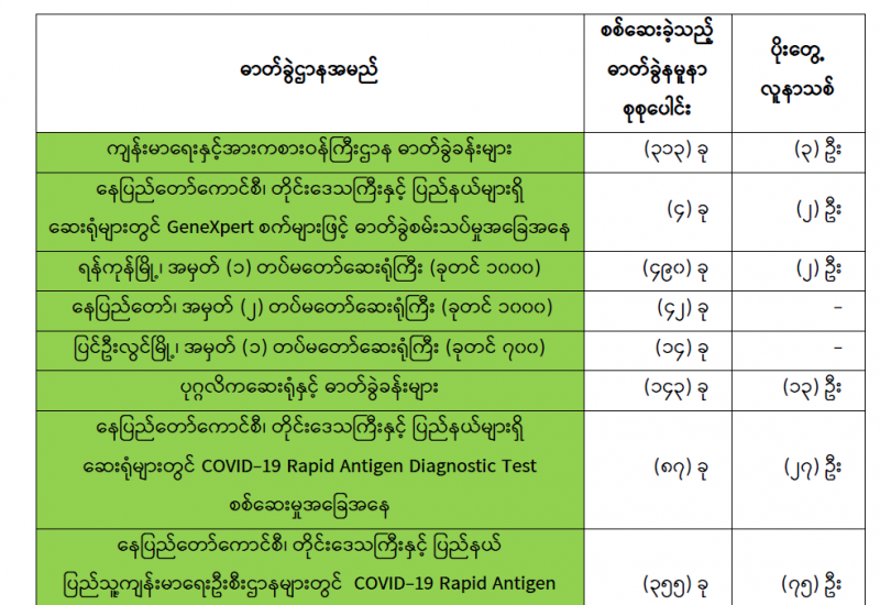 (၂-၆-၂၀၂၁) ရက်နေ့၊ ည (၈:၀၀) နာရီမှ (၃-၆-၂၀၂၁) ရက်နေ့၊ ည (၈:၀၀) နာရီအတွင်း ဓာတ်ခွဲနမူနာစုစုပေါင်း (၁,၄၄၈) ခုအား စစ်ဆေးပြီးစီးခဲ့ရာ COVID-19 ရောဂါ ဓာတ်ခွဲအတည်ပြု လူနာသစ် (၁၂၂) ဦး တွေ့ရှိရပါသည်။ သို့ဖြစ်ပါ၍ ယနေ့အထိ ဓာတ်ခွဲနမူနာ စုစုပေါင်း (၂,၆၂၆,၄၆၈) ခုအား စစ်ဆေးခဲ့ပြီး COVID-19 ဓာတ်ခွဲအတည်ပြုလူနာ စုစုပေါင်း (၁၄၃,၉၄၅) ဦး ရှိပြီ ဖြစ်ပါသည်။