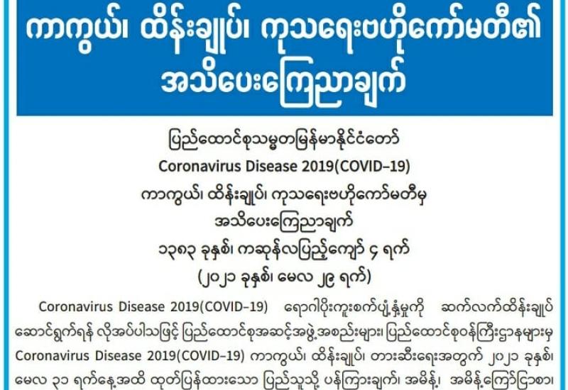 (၂၉-၅-၂၀၂၁) ရက်နေ့၊ ည (၈:၀၀) နာရီမှ (၃၀-၅-၂၀၂၁) ရက်နေ့၊ ည (၈:၀၀) နာရီအတွင်း ဓာတ်ခွဲနမူနာစုစုပေါင်း (၉၁၂) ခုအား စစ်ဆေးပြီးစီးခဲ့ရာ COVID-19 ရောဂါ ဓာတ်ခွဲအတည်ပြု လူနာသစ် (၄၅) ဦး တွေ့ရှိရပါသည်။ သို့ဖြစ်ပါ၍ ယနေ့အထိ ဓာတ်ခွဲနမူနာ စုစုပေါင်း (၂,၆၁၉,၆၄၂) ခု အား စစ်ဆေးခဲ့ပြီး COVID-19 ဓာတ်ခွဲအတည်ပြုလူနာ စုစုပေါင်း (၁၄၃,၅၇၁) ဦး ရှိပြီ ဖြစ်ပါသည်။