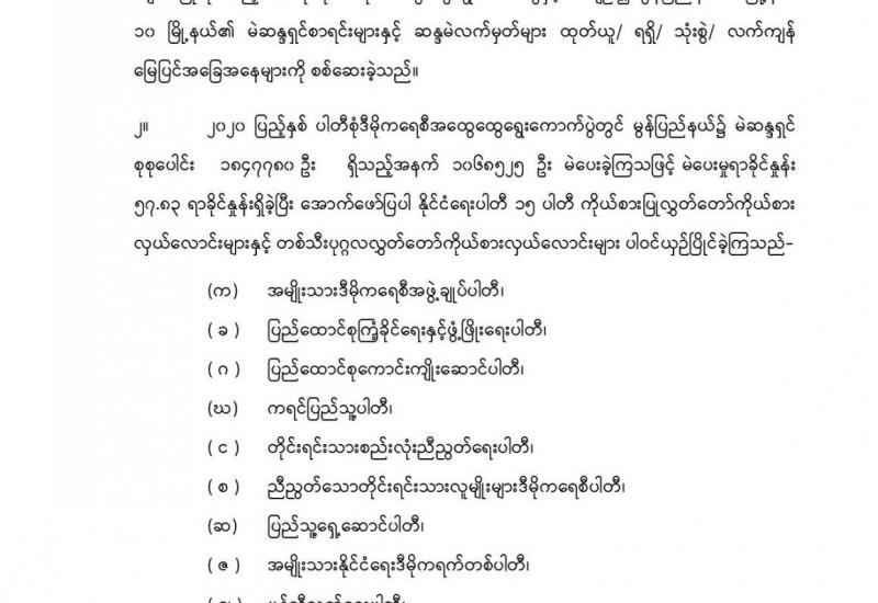 မြေလွတ်၊ မြေလပ်နှင့်မြေရိုင်းများကို မှန်ကန်အကျိုး ရှိစွာ အသုံးချနိုင်ခြင်းဖြင့် စိုက်ပျိုးရေးလုပ်ငန်းများ၊ မွေးမြူရေးလုပ်ငန်းများအပါအဝင် စီးပွားရေး လုပ်ငန်းများ ဖွံ့ဖြိုးလာစေရန်ရည်ရွယ်၍ မြေလွတ်၊ မြေလပ်နှင့် မြေရိုင်းများအပေါ်တွင် တည်ဆဲဥပဒေ များနှင့် အညီ လုပ်ကိုင်ခွင့်များ ခွင့်ပြုပေးလျက်ရှိရာ ဓာတ်သတ္တုထုတ်လုပ်ခြင်း လုပ်ငန်းများအတွက် သတ္တုတွင်းဝန်ကြီးဌာန၏ သဘောထားမှတ်ချက် အရ လည်းကောင်း၊ အစိုးရက ခွင့်ပြုထားသော ဥပဒေနှင့်ညီညွတ်သည့် အခြားလုပ်ငန်းများအတွက် သက်ဆိုင်ရာဝန်ကြီးဌာန၏ သဘောထားမှတ်ချက်အရ လည်းကောင်း မြေလွတ်၊ မြေလပ်နှင့် မြေရိုင်းများ စီမံခန့်ခွဲရေးဗဟိုကော်မတီက စိစစ်ခွင့်ပြုပေး လျက်ရှိသည်။
