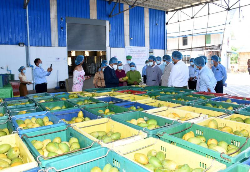 စီးပွားရေးနှင့် ကူးသန်းရောင်းဝယ်ရေးဝန်ကြီးဌာန ပြည်ထောင်စုဝန်ကြီး ဒေါက်တာ ပွင့်ဆန်းနှင့် စိုက်ပျိုးရေး၊ မွေးမြူရေးနှင့် ဆည်မြောင်းဝန်ကြီးဌာန ပြည်ထောင်စုဝန်ကြီး ဦးတင်ထွဋ်ဦး တို့သည် ယနေ့နံနက်ပိုင်းတွင် နေပြည်တော်၊ ဒက္ခိဏသီရိစက်မှုဇုန်၊ မဉ္ဇူသက လမ်းရှိ MYANMAR GOLDEN PRODUCE CO., LTD ၏ သစ်သီးဝလံ တန်ဖိုးမြှင့် ထုတ်လုပ်သည့် စက်ရုံကို ကြည့်ရှုစစ်ဆေးသည်။