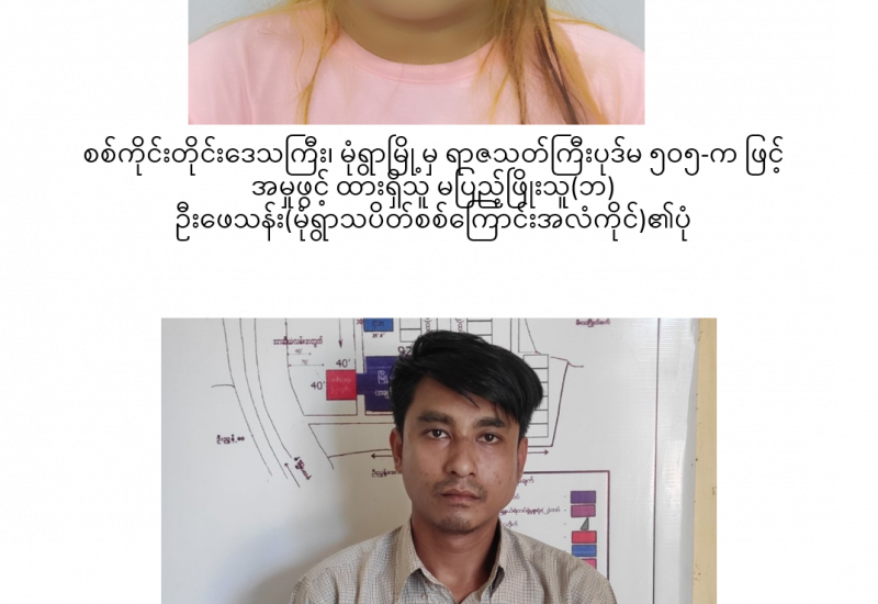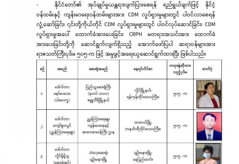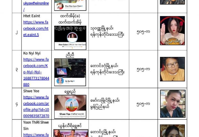 နိုင်ငံတော်၏ အုပ်ချုပ်မှုယန္တရားပျက်ပြားစေရန်ရည်ရွက်ချက်ဖြင့် နိုင်ငံ့ဝန်ထမ်းများအား CDM လှုပ်ရှားမှုတွင် ပါဝင်စေရန်လှုံ့ဆော်ခြင်း၊ CRPH မတရားအသင်းအား ထောက်ခံသည့် အကြောင်းအရာများ၊ မမှန်သတင်းများအားဖြန့်ဝေခြင်း၊ နိုင်ငံတော်တည်ငြိမ်အေးချမ်းမှုကို ပျက်ပြားစေပြီး ဆူပူအုံကြွမှုဖြစ်ပေါ်စေရန်နှင့် အများပြည်သူအထိတ်တလန့်ဖြစ်စေရန် အတွက် သွေးထိုးလှုံ့ဆော်မှုများပြုလုပ်ခြင်း၊ Social Pumishment ပြုလုပ်ခြင်းများကို လူမှုကွန်ရက် စာမျက်နှာများတွင် ရည်ရွယ်ချက်ရှိရှိ ဖြင့်ဖော်ပြခြင်းနှင့် ဖြန့်ဝေခြင်းများ ဆောင်ရွက် လျက်ရှိသည့် အောက်ဖော်ပြပါ အနုပညာရှင်အချို့နှင့် အခြားပါဝင်ပတ်သက်သူများအား ရာဇသတ်ကြီးပုဒ်မ ၅၀၅-က ဖြင့် အမှုဖွင့်အရေးယူ ဆောင်ရွက်လျက်ရှိပါသည်။