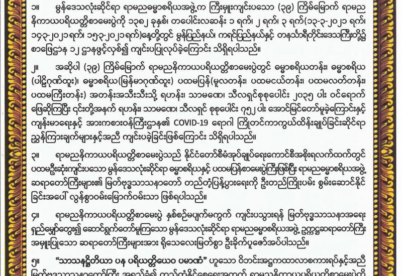 မွန်ဒေသလုံးဆိုင်ရာ ရာမညဓမ္မာစရိယအဖွဲ့က ကြီးမှူးကျင်းပသော (၃၉)ကြိမ်မြောက် ရာမည နိကာယပရိယတ္တိစာမေးပွဲကြီးကို မတ် ၁၃ ရက်မှ ၁၅ ရက်အထိ မွန်ပြည်နယ်၊ ကရင်ပြည်နယ် နှင့်တနင်္သာရီတိုင်းဒေသကြီးတို့ရှိ စာဖြေဌာန ၁၂ ဌာနတို့တွင် ကျန်းမာရေးနှင့်အားကစားဝန်ကြီး ဌာနက ထုတ်ပြန်ထားသော COVID-19 ရောဂါ ကာကွယ်တားဆီးရေးဆိုင်ရာ ညွှန်ကြားချက် များနှင့်အညီ အောင်မြင်စွာ ကျင်းပနိုင်ခဲ့သည်။