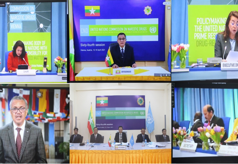 ပြည်ထဲရေးဝန်ကြီးဌာန၊ ဒုတိယဝန်ကြီး ဒုတိယဗိုလ်ချုပ်ကြီးသန်းလှိုင် ဦးဆောင်သော မြန်မာကိုယ်စားလှယ်အဖွဲ့သည် ဩစတြီးယားနိုင်ငံ၊ ဗီယင်နာမြို့၌ ဧပြီ ၁၂ ရက်မှ ၁၆ ရက်အထိ ကျင်းပသည့် (၆၄) ကြိမ်မြောက် မူးယစ်ဆေးဝါးကော်မရှင်အစည်းအဝေးသို့ ဗီဒီယိုကွန်ဖရင့် စနစ်ဖြင့် တက်ရောက်ခဲ့ကြသည်။