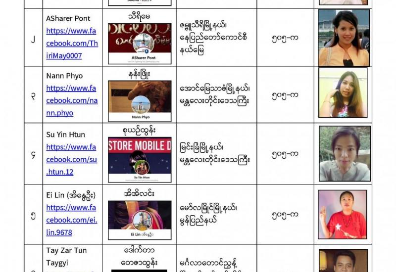 နိုင်ငံတော်၏ အုပ်ချုပ်မှုယန္တရားပျက်ပြားစေရန်ရည်ရွက်ချက်ဖြင့် နိုင်ငံ့ဝန်ထမ်းများအား CDM လှုပ်ရှားမှုတွင် ပါဝင်စေရန်လှုံ့ဆော်ခြင်း၊ CRPH မတရားအသင်းအား ထောက်ခံသည့် အကြောင်းအရာများ၊ မမှန်သတင်းများအားဖြန့်ဝေခြင်း၊ နိုင်ငံတော်တည်ငြိမ်အေးချမ်းမှုကို ပျက်ပြားစေပြီး ဆူပူအုံကြွမှုဖြစ်ပေါ်စေရန်နှင့် အများပြည်သူအထိတ်တလန့်ဖြစ်စေရန် အတွက် သွေးထိုးလှုံ့ဆော်မှုများပြုလုပ်ခြင်း၊ Social Pumishment ပြုလုပ်ခြင်းများကို လူမှုကွန်ရက် စာမျက်နှာများတွင် ရည်ရွယ်ချက်ရှိရှိ ဖြင့်ဖော်ပြခြင်းနှင့် ဖြန့်ဝေခြင်းများ ဆောင်ရွက် လျက်ရှိသည့် အောက်ဖော်ပြပါ အနုပညာရှင်အချို့နှင့် အခြားပါဝင်ပတ်သက်သူများအား ရာဇသတ်ကြီးပုဒ်မ ၅၀၅-က ဖြင့် အမှုဖွင့်အရေးယူ ဆောင်ရွက်လျက်ရှိပါသည်။
