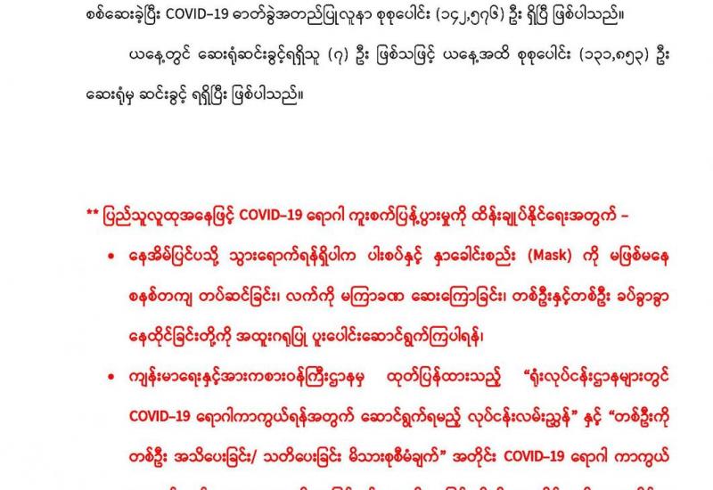 ပြည်သူများ ခရီးသွားလာမှုလွယ်ကူစေရေး အတွက် ကိုဗစ်-၁၉ရောဂါဖြစ်ပွားစဉ်ကာလအတွင်း ရပ်နား ထားခဲ့ရသော မလိခအမြန်ရေယာဉ် စစ်တွေ - ရသေ့တောင် - ဘူးသီးတောင် ခရီးစဉ်ကိုလည်း မတ်လဆန်းမှ စတင်ကာ ပုံမှန်အတိုင်း ပြန်လည် ပြေးဆွဲလျက်ရှိနေပြီဖြစ်သည်ကိုလည်း မြင်တွေ့ရ သကဲ့သို့ မတ်လ ၂၄ ရက်နေ့တွင်လည်း မန္တလေး - ဗန်းမော် သင်္ဘောခရီးစဉ်များကို ပုံမှန်ပြေးဆွဲ ပေးလျက်ရှိနေပြီ ဖြစ်ပါသည်။ ။