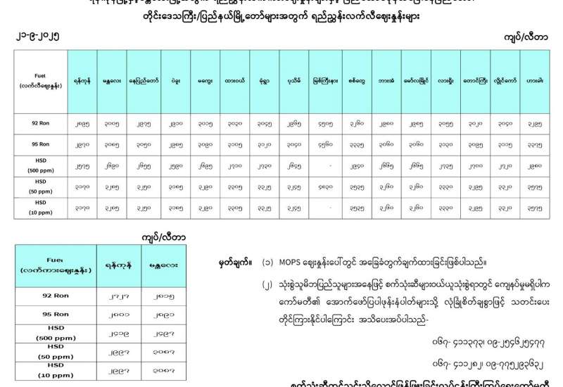 ရန်ကုန်မြို့နှင့် မန္တလေးမြို့အတွက် ရည်ညွှန်းလက်ကားဈေးနှုန်းများနှင့် ပြည်ထောင်စုနယ်မြေ နေပြည်တော်၊ တိုင်းဒေသကြီး/ပြည်နယ် မြို့တော်များအတွက် ရည်ညွှန်းလက်လီဈေးနှုန်းများ