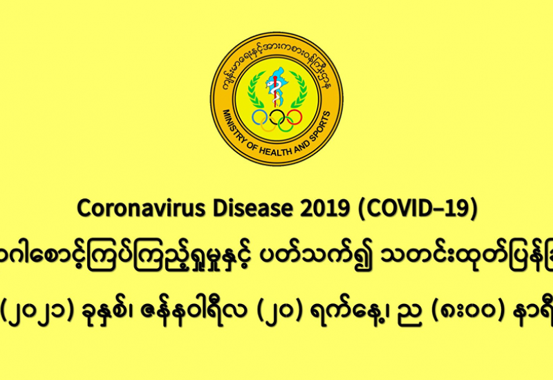 (၁၉-၁-၂၀၂၁) ရက်နေ့၊ ည (၈:၀၀) နာရီမှ (၂၀-၁-၂၀၂၁) ရက်နေ့၊ ည (၈:၀၀) နာရီ အတွင်း ဓာတ်ခွဲနမူနာ စုစုပေါင်း (၂၀,၄၇၆) ခုအားစစ်ဆေးပြီးစီးခဲ့ရာ COVID-19 ရောဂါ ဓာတ်ခွဲ အတည်ပြု လူနာသစ် (၄၇၈) ဦး တွေ့ရှိရပါသည်။