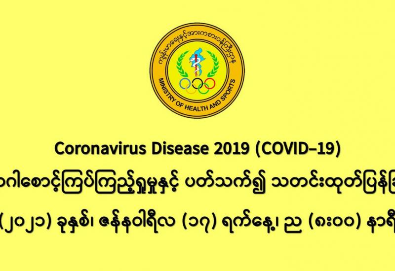 (၁၆-၁-၂၀၂၁) ရက်နေ့၊ ည (၈:၀၀) နာရီမှ (၁၇-၁-၂၀၂၁) ရက်နေ့၊ ည (၈:၀၀) နာရီ အတွင်း ဓာတ်ခွဲနမူနာ စုစုပေါင်း (၁၇,၆၅၆) ခုအား စစ်ဆေးပြီးစီးခဲ့ရာ COVID-19 ရောဂါ ဓာတ်ခွဲ အတည်ပြု လူနာသစ် (၄၄၉) ဦး တွေ့ရှိရပါသည်။