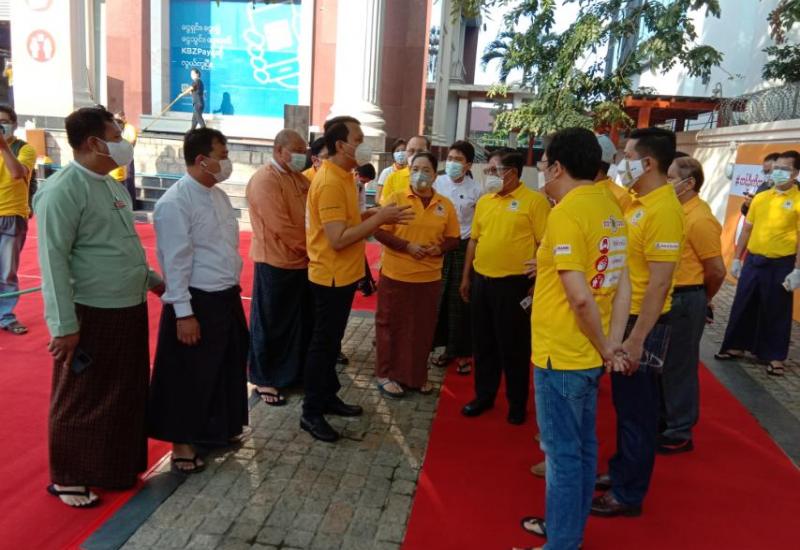 Stop Covid-19 အဝါရောင် အသိပညာပေး ပိုစတာဖွင့်ပွဲကို ယမန်နေ့မွန်လွဲ ၃ နာရီက ရန်ကုန်မြို့ ဆူးလေဘုရားလမ်းရှိ Tourist Burma အဆောက်အဦ ရှေ့၌ ကျင်းပသည်။