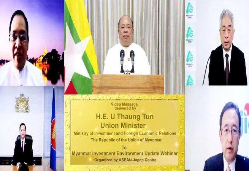 ရင်းနှီးမြှုပ်နှံမှုနှင့် နိုင်ငံခြားစီးပွားဆက်သွယ်ရေးဝန်ကြီးဌာနနှင့် ဂျပန်အပြည်ပြည်ဆိုင်ရာ ပူးပေါင်းဆောင်ရွက်ရေး အေဂျင်စီတို့၏ ကူညီပံ့ပိုးမှု၊ အာဆီယံ-ဂျပန်စင်တာနှင့် မြန်မာသံရုံး (တိုကျိုမြို့)တို့၏ ပူးပေါင်းဆောင်ရွက်မှုတို့ဖြင့် Myanmar Investment Environment Update Webinar ကို ယနေ့နံနက်ပိုင်းတွင် ဂျပန်နိုင်ငံ၌ Virtual စနစ်ဖြင့်ကျင်းပရာ မြန်မာနိုင်ငံ ရင်းနှီးမြှုပ်နှံမှုကော်မရှင်ဥက္ကဋ္ဌ၊ ရင်းနှီးမြှုပ်နှံမှုနှင့် နိုင်ငံခြားစီးပွားဆက်သွယ်ရေးဝန်ကြီးဌာန ပြည်ထောင်စုဝန်ကြီး ဦးသောင်းထွန်း က Video Message ပေးပို့သည်။