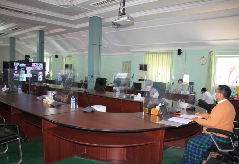 ပဲခူးတိုင်းဒေသကြီးအစိုးရအဖွဲ့ရုံး၊ တော်ဝင်ဟံသာခန်းမ၌ ယမန်နေ့ မွန်းလွဲ ၂ နာရီက ပဲခူးတိုင်းဒေသကြီး ကိုဗစ်-၁၉ ရောဂါ ထိန်းချုပ်ရေးနှင့် အရေးပေါ်တုံ့ပြန်ရေးကော်မတီ လုပ်ငန်းညှိနှိုင်း အစည်းအဝေးအား Online Meeting စနစ်ဖြင့် ကျင်းပပြုလုပ်ခဲ့သည်။