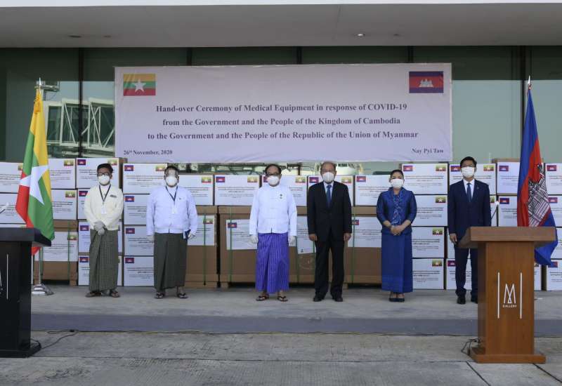 ကမ္ဘောဒီးယားနိုင်ငံ အစိုးရနှင့် ပြည်သူများက မြန်မာနိုင်ငံ အစိုးရနှင့် ပြည်သူများ ကိုဗစ်-၁၉ ကာကွယ်၊ ထိန်းချုပ်၊ ကုသရေး လုပ်ငန်းများတွင် အသုံးပြုနိုင်ရန်အတွက် အထောက်အကူပြုပစ္စည်းများ လှူဒါန်းမှုကို ယနေ့ နံနက်ပိုင်းတွင် နေပြည်တော် အပြည်ပြည်ဆိုင်ရာ လေဆိပ်၌ ပြုလုပ်ရာ Coronavirus Disease 2019 (COVID-19) ကာကွယ်၊ ထိန်းချုပ်၊ ကုသရေး အမျိုးသားအဆင့် ဗဟိုကော်မတီ အတွင်းရေးမှူး (၂)၊ ကျန်းမာရေးနှင့်အားကစားဝန်ကြီးဌာန၊ ပြည်ထောင်စုဝန်ကြီး ဒေါက်တာ မြင့်ထွေးက လက်ခံခဲ့သည်။