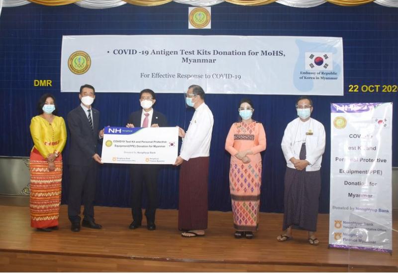 ကျန်းမာရေးနှင့် အားကစားဝန်ကြီးဌာနသို့ ကိုရီးယားသမ္မတနိုင်ငံအခြေစိုက် Shinhan Bank ၊ Shwe Daehan Motors Co., Ltd နှင့် NongHyup Bank and NongHyup Finance Myanmar တို့က Covid-19 Antigen Test Kits များနှင့် PPE များ ပေးအပ်လှူဒါန်းပွဲ အခမ်းအနားကို ယနေ့နံနက် ၁၁ နာရီက ရန်ကုန်မြို့ ဒဂုံမြို့နယ် ဇီဝကလမ်း အမှတ်(၅)ရှိ ဆေးသုတေသနဦးစီးဌာန(ရုံးချုပ်) အစည်းအဝေးခန်းမ၌ ပြုလုပ်သည်။