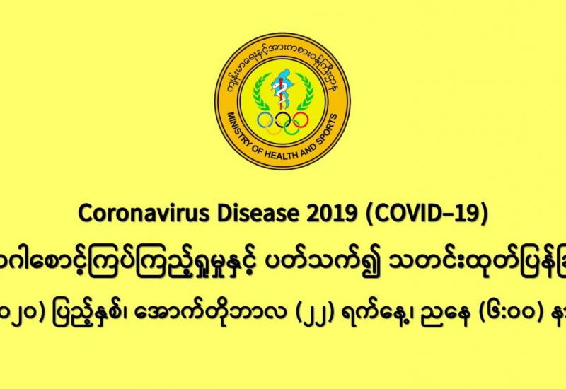 မြန်မာနိုင်ငံတွင် ကိုဗစ်-၁၉ ရောဂါပိုး စတင်တွေ့ရှိခဲ့သည့် ၂၀၂၀ ပြည့်နှစ် မတ်လ ၂၃ ရက်နေ့မှ အောက်တိုဘာလ ၂၀ ရက်နေ့အထိ ရောဂါပိုး ရှိ၊ မရှိ လူဦးရေ ၅၃၈၀၈၆ ဦးကို ဓာတ်ခွဲစစ်ဆေးခဲ့ရာ ရောဂါပိုးတွေ့သူ ၃၈၅၀၂ ဦး၊ သေဆုံးသူ ၉၄၅ ဦးနှင့် ရောဂါပျောက်ကင်းသူ ၁၈၁၄၇ ဦးရှိသည်ကို တွေ့ရမည်ဖြစ်သည်။