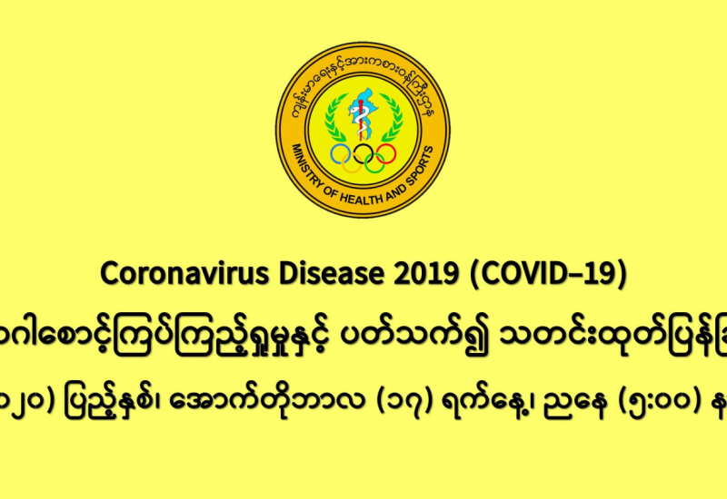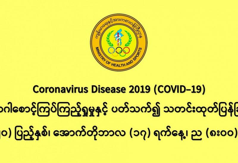 (၁၆-၁၀-၂၀၂၀) ရက်နေ့၊ ည (၈:၀၀)နာရီမှ (၁၇-၁၀-၂၀၂၀) ရက်နေ့၊ ည (၈:၀၀) နာရီ အတွင်း ဓာတ်ခွဲနမူနာ စုစုပေါင်း (၁၉,၇၃၆) ခုအား စစ်ဆေးပြီးစီးခဲ့ရာ COVID-19 ရောဂါ ဓာတ်ခွဲအတည်ပြု လူနာသစ် (၁,၃၈၇)ဦး တွေ့ရှိရပါသည်။