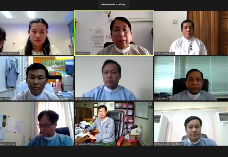 မြန်မာနိုင်ငံ ဒစ်ဂျစ်တယ်မီဒီယာအသင်း ဖြစ်မြောက်ရေးကော်မတီက ကြီးမှူးကျင်းပသည့် ဒစ်ဂျစ်တယ်မီဒီယာ ရေစီးနှင့် အခွင့်အလမ်းများဆိုင်ရာ အွန်လိုင်းဆွေးနွေးပွဲ (Digital Media Trends and Opportunities Webinar) ကို ယနေ့ မွန်းလွဲ ၁ နာရီတွင် ပြုလုပ်ရာ ပြန်ကြားရေးဝန်ကြီးဌာန ပြည်ထောင်စုဝန်ကြီး‌ ဒေါက်တာဖေမြင့်၊ ဒုတိယဝန်ကြီး ဦးအောင်လှထွန်း၊ အမြဲတမ်းအတွင်းဝန် ဦးမျိုးမြင့်မောင်၊ ဌာနဆိုင်ရာအကြီးအကဲများနှင့် မြန်မာနိုင်ငံ ဒစ်ဂျစ်တယ်အသင်းဖြစ်မြောက်ရေး ကော်မတီဝင်များ၊ သတင်းမီဒီယာသမားများနှင့် စိတ်ပါဝင်စားသူများက သက်ဆိုင်ရာနေရာ အသီးသီးမှ ဗီဒီယိုကွန်ဖရင့်စနစ်ဖြင့် တက်ရောက်ကြသည်။
