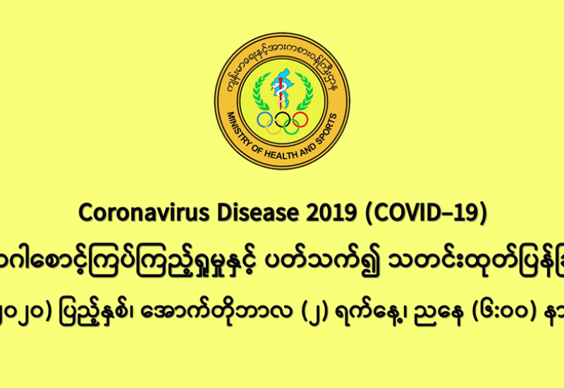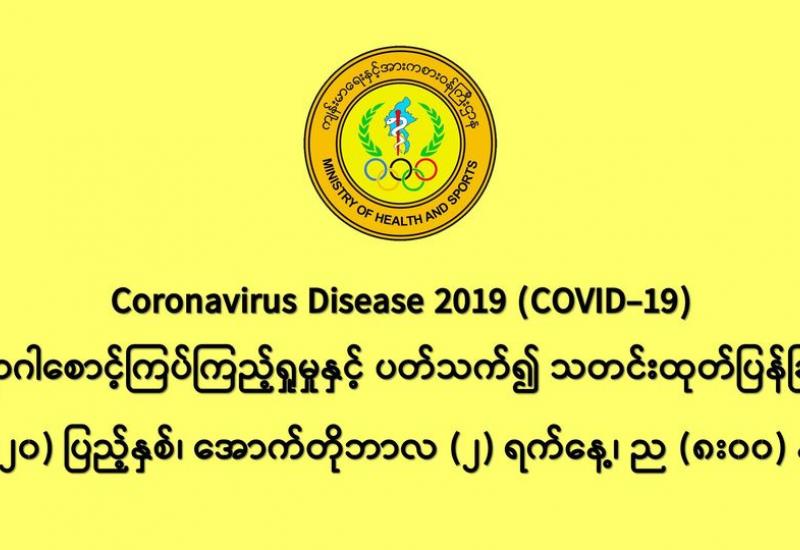 (၂-၁၀-၂၀၂၀) ရက်နေ့၊ ည (၈:၀၀)နာရီမှ (၃-၁၀-၂၀၂၀) ရက်နေ့၊ ည (၈:၀၀)နာရီ အတွင်း ဓာတ်ခွဲနမူနာ စုစုပေါင်း (၈,၁၉၅) ခုအား စစ်ဆေးပြီးစီးခဲ့ရာ COVID-19 ရောဂါ ဓာတ်ခွဲအတည်ပြု လူနာသစ် (၉၇၈)ဦး တွေ့ရှိရပါသည်။