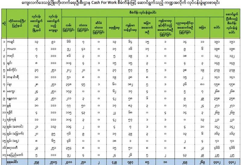 ကိုဗစ်-၁၉ ရောဂါ ဖြစ်ပွားစဉ်ကာလအတွင်း ကျေးလက်နေပြည်သူများ၏ မိသားစုဝင်ငွေရရှိရေး လုပ်ငန်းများထိခိုက်မှု ဖြစ်ပေါ်ထိခိုက်မှုများကို ကုစားနိုင်ရန်အတွက် နိုင်ငံတော်အစိုးရမှ Covid-19 Economic Relief Plan(CERP) ကို ရေးဆွဲထုတ်ပြန်ခဲ့ပြီး အဆိုပါစီမံချက်အရ ကျေးလက်ဒေသဖွံ့ဖြိုးတိုးတက်ရေးဦးစီးဌာန က Cash For Work (ဝင်ငွေရရှိရေး အလုပ် အကိုင်ဖန်တီးပေး) စီမံကိန်းကို ဇူလိုင်လမှ စက်တင်ဘာလအထိ သုံးလတာကာလအတွင်း မြို့နယ် ၂၅၉ မြို့နယ်ရှိ ကျေးရွာပေါင်း ၂၅၀၅ ရွာတွင် အကောင်အထည်ဖော်ဆောင်ရွက်ခဲ့ရာ ယခုအခါ ရာနှုန်းပြည့်ဆောင်ရွက်ပြီးစီးနေပြီဖြစ်ကြောင်း သိရသည်။