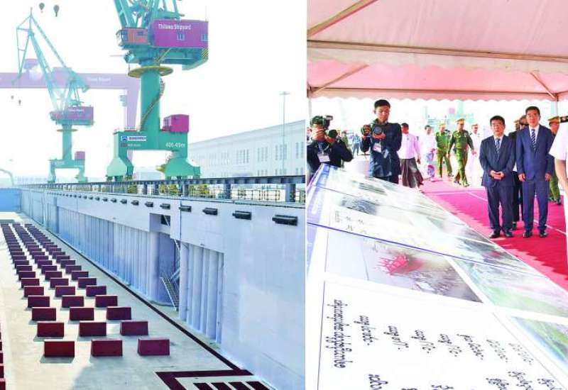 တပ်မတော်(ရေ)မှ ရေတပ်သင်္ဘောကျင်းဌာနချုပ် တန် ၄၀၀၀၀ ရေလုံလွန်းကျင်း ဖွင့်ပွဲအခမ်းအနား၊ ရေငုပ်သင်္ဘောတိုက်ဖျက်ရေးရေယာဉ်များ၏ ဧရာခင်းမင်္ဂလာအခမ်းအနားနှင့် စစ်ရေယာဉ်များ တပ်တော်ဝင်ခြင်းအခမ်းအနားများအား ယနေ့နံနက်ပိုင်းတွင် သန်လျင်တပ်နယ် ရေတပ်သင်္ဘောကျင်းဌာနချုပ် တန် ၄၀၀၀၀ ရေလုံလွန်းကျင်း တည်ဆောက်ရေးအလုပ်ရုံနှင့် ရေတပ်ဆိပ်ခံတံတားတို့၌ကျင်းပရာ နိုင်ငံတော်လုံခြုံရေးနှင့်အေးချမ်းသာယာရေးကော်မရှင်ဥက္ကဋ္ဌ တပ်မတော်ကာကွယ်ရေးဦးစီးချုပ် ဗိုလ်ချုပ်မှူးကြီးမင်းအောင်လှိုင် တက်ရောက်ချီးမြှင့်သည်။