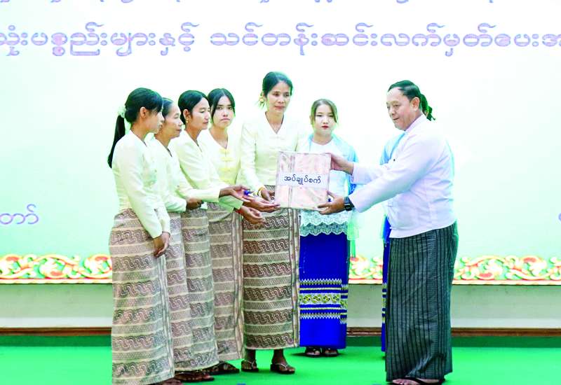 အသေးစားကုန်ထုတ်လုပ်ငန်းများဖန်တီးပေးနိုင်ရေးနှင့် ကျေးလက်နေမိသားစုဝင်ငွေတိုးရေး စီမံကိန်းလုပ်ငန်းဆိုင်ရာ လုပ်ငန်းသုံးပစ္စည်းများနှင့် သင်တန်းဆင်းလက်မှတ်များ ပေးအပ်ပွဲအခမ်းအနားကို ယနေ့နံနက်ပိုင်းက နေပြည်တော်ကောင်စီနယ်မြေ အစိုးရအဖွဲ့ရုံး ဇဗ္ဗူသီရိခန်းမ၌ ကျင်းပသည်။