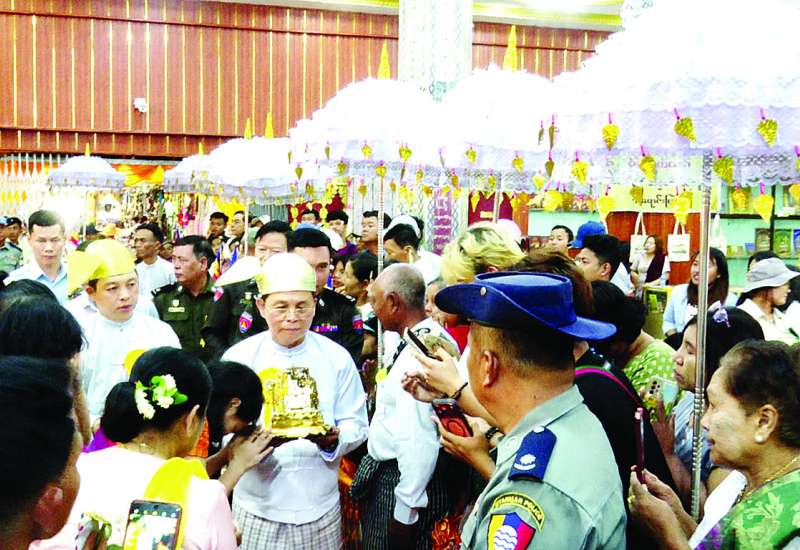 ၂၀၂၆ ခုနှစ်၊ သာသနာတော်ဆိုင်ရာ ဘွဲ့တံဆိပ်တော် ဆက်ကပ်ခံယူတော်မူမည့် ဆရာတော်ကြီးများအား နေ့ဆွမ်းဆက်ကပ်လှူဒါန်းခြင်းကို ယနေ့နံနက်ပိုင်းတွင် နေပြည်တော်၊ မာရဝိဇယဗုဒ္ဓဥယျာဉ်တော်ပရိဝုဏ်အတွင်းရှိ အဂ္ဂါဓိပတိသာသနာ့ဗိမာန်တော်ကြီး၌ ကျင်းပရာ ပြည်ထောင်စုသမ္မတမြန်မာနိုင်ငံတော်ယာယီသမ္မတ နိုင်ငံတော်လုံခြုံရေးနှင့်အေးချမ်းသာယာရေးကော်မရှင်ဥက္ကဋ္ဌ ဗိုလ်ချုပ်မှူးကြီး မင်းအောင်လှိုင်နှင့် ဇနီး ဒေါ်ကြူကြူလှတို့ တက်ရောက်၍ နေ့ဆွမ်းဆက်ကပ်လှူဒါန်းသည်။