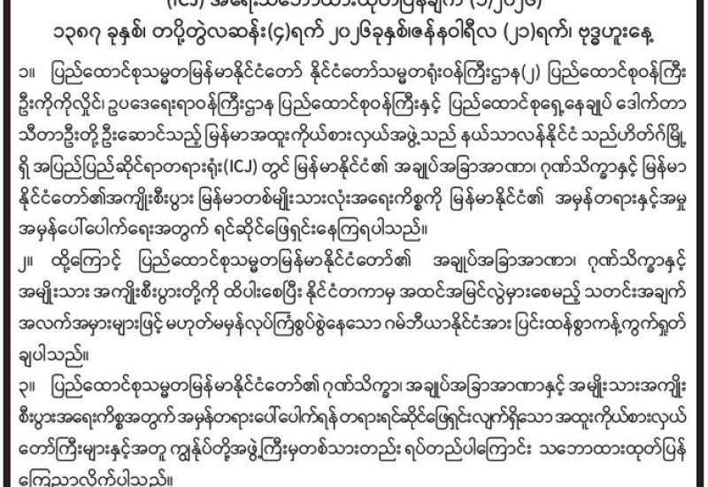 ပြည်ထောင်စုသမ္မတမြန်မာနိုင်ငံတော်၊ နိုင်ငံတော်သမ္မတရုံးဝန်ကြီးဌာန (၂) ပြည်ထောင်စုဝန်ကြီး ဦးကိုကိုလှိုင်၊ ဥပဒေရေးရာဝန်ကြီးဌာန ပြည်​ထောင်စုဝန်ကြီးနှင့် ပြည်ထောင်စုရှေ့နေချုပ် ဒေါက်တာ သီတာဦးတို့ ဦးဆောင်သည့် မြန်မာကိုယ်စားလှယ်အဖွဲ့သည် ၂၀၂၆ ခုနှစ်၊ ဇန်နဝါရီလ (၁၂)ရက်နေ့မှ ဇန်နဝါရီလ (၂၉)ရက်နေ့အထိ နယ်သာလန်နိုင်ငံ၊ သည်ဟိတ်ဂ်မြို့ရှိ အပြည်ပြည်ဆိုင်ရာတရားရုံး International Court of Justice - (ICJ)သို့ သွားရောက်၍ ဂမ်ဘီယာနိုင်ငံ၏ စွပ်စွဲချက်များအား ဥပဒေနှင့်အညီ ဖြေရှင်းဆောင်ရွက်နေခြင်းသည် နိုင်ငံတစ်နိုင်ငံအနေဖြင့် တာဝန်ယူမှုရှိသော လုပ်ရပ် တစ်ခုဖြစ်ပြီး နိုင်ငံတကာဥပ​ဒေစည်းမျဉ်းများကို လေးစားလိုက်နာလိုသည့်ဆန္ဒကိုလည်း ဖော်ပြနေ ခြင်းဖြစ်ပါသည်။