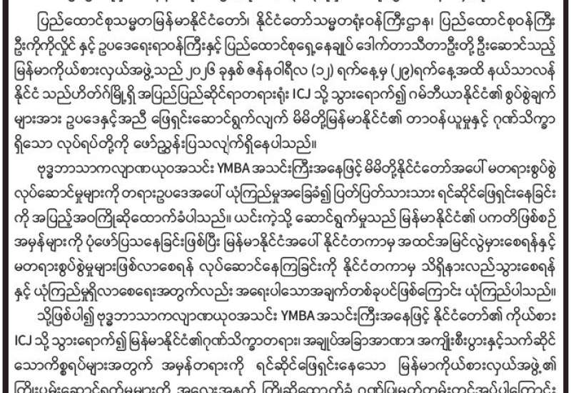 ဗုဒ္ဓဘာသာကလျာဏယုဝအသင်း YMBA (ဗဟို)အလုပ်အမှုဆောင်အဖွဲ့၏ သဘောထားထုတ်ပြန်ကြေညာချက်