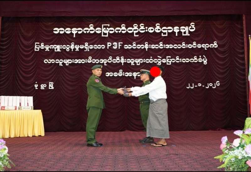 နိုင်ငံတော်အစိုးရသည် PDF အပါအဝင် အဖွဲ့အစည်းအမျိုးမျိုးအမည်ခံ၍ လက်နက်ကိုင်ဆန့်ကျင်လျက်ရှိသည့် အဖွဲ့အစည်းများအတွင်း ရောက်ရှိနေသူများအား ဥပဒေဘောင်အတွင်းသို့ ပြန်လည်ဝင်ရောက်ရန် ဖိတ်ခေါ်၍ ဥပဒေဘောင်အတွင်းသို့ ပြန်လည်ဝင်ရောက်လာကြသူများကိုလည်း လိုအပ်သည့် ကူညီပံ့ပိုးမှုများ ဆောင်ရွက်ပေးလျက်ရှိရာ နိုင်ငံတော်နှင့် တပ်မတော်၏ ငြိမ်းချမ်းရေးလုပ်ငန်းစဉ်များကို နားလည်သဘောပေါက်လာသည့် PDF အမည်ခံအဖွဲ့ဝင် အမျိုးသား ၂၂ ဦးနှင့် အမျိုးသမီး ၂ ဦးတို့သည် လက်နက်၊ ခဲယမ်းများနှင့်အတူ ယနေ့တွင် ဥပဒေဘောင်အတွင်းသို့ ဝင်ရောက်လာကြသည်။