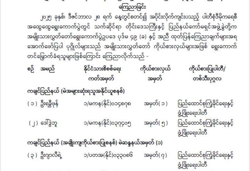 အမျိုးသားလွှတ်တော်ကိုယ်စားလှယ်အဖြစ် ရွေးကောက်တင်မြှောက်ခံရသူများ အမည်စာရင်း ကြေညာခြင်း