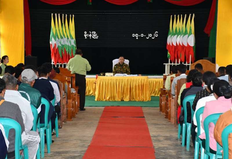 ရှမ်းပြည်နယ်(တောင်ပိုင်း)၊ မိုးနဲမြို့နယ်၌ ၂၀၂၅ ခုနှစ်၊ ပါတီစုံအထွေထွေရွေးကောက်ပွဲအပိုင်း (၃) အောင်မြင်စွာ ကျင်းပနိုင်ရေး ဌာနဆိုင်ရာများနှင့် တွေ့ဆုံပွဲကို ယနေ့မွန်းလွဲပိုင်းတွင် အဆိုပါမြို့ရှိ ကမ္ဘောဇခန်းမတွင် ပြုလုပ်ရာ အရှေ့အလယ်ပိုင်းတိုင်းစစ်ဌာနချုပ်တိုင်မှူး ဗိုလ်ချုပ် စိုးမြတ်ထွဋ် နှင့်တာဝန်ရှိသူများ၊ မြို့နယ်ရွေးကောက်ပွဲကော်မရှင်မှ တာဝန်ရှိသူများ၊ ဌာနဆိုင်ရာများမှတာဝန်ရှိသူများနှင့် မဲရုံများတွင် တာဝန်ထမ်းဆောင်မည့် ဌာနဆိုင်ရာဝန်ထမ်းများ တက်ရောက်ကြသည်။