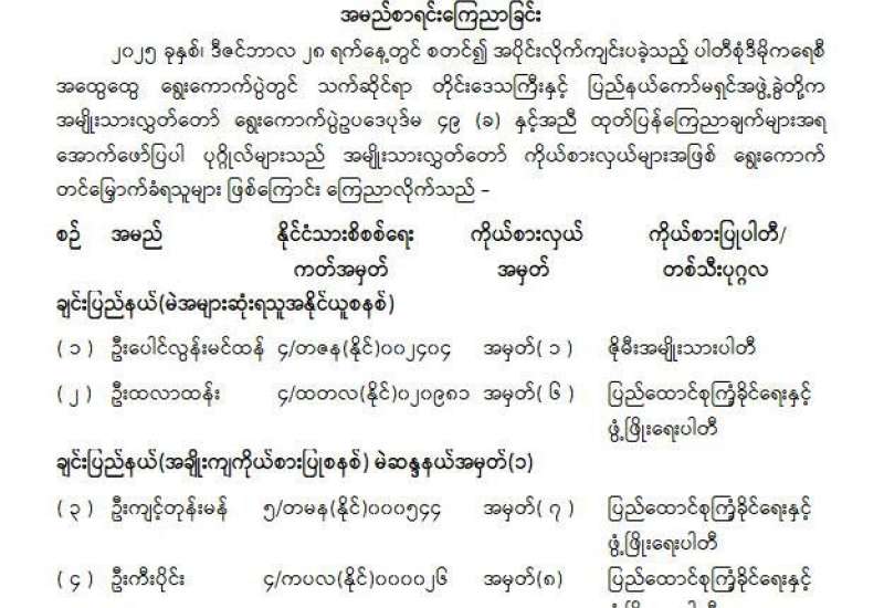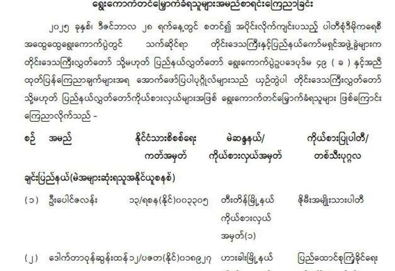 တိုင်းဒေသကြီးလွှတ်တော် သို့မဟုတ် ပြည်နယ်လွှတ်တော်ကိုယ်စားလှယ်အဖြစ် ရွေးကောက်တင်မြှောက်ခံရသူများ အမည်စာရင်းကြေညာခြင်း