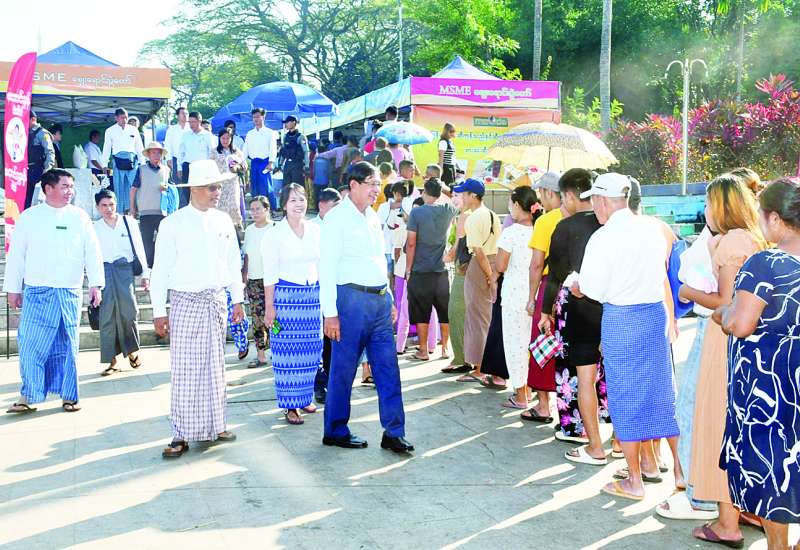 ပြည်သူ့ရင်ပြင်၌ ကျင်းပလျက်ရှိသည့် MSME စျေးရောင်းပွဲတော်တွင် ဝယ်ယူအားပေးသူပြည်သူများဖြင့် အထူးစည်ကား