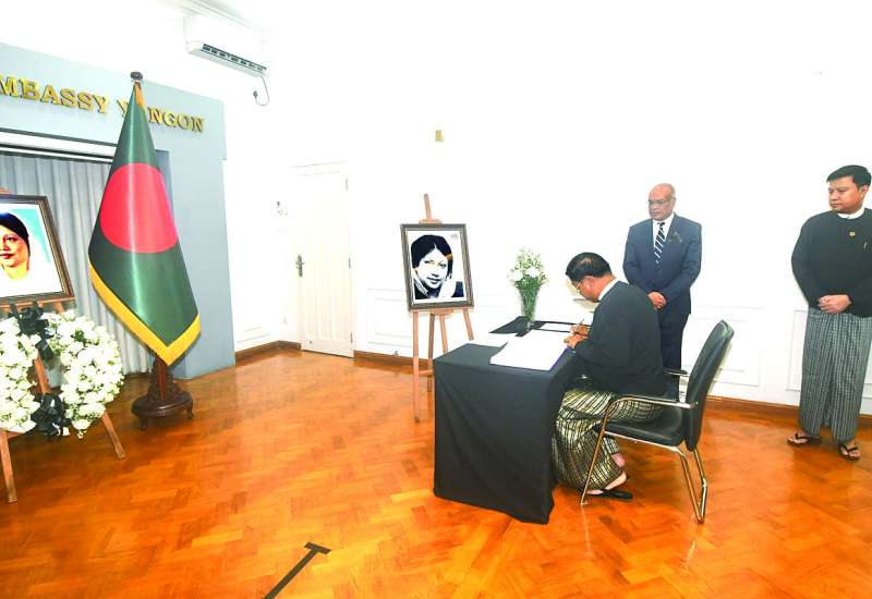 ဘင်္ဂလားဒေ့ရှ်နိုင်ငံ၏ ပထမဆုံးအမျိုးသမီးဝန်ကြီးချုပ် ဘေဂမ်ခါလီဒါဇီယာသည် ၂၀၂၅ ခုနှစ် ဒီဇင်ဘာ ၃၀ ရက်တွင် ကွယ်လွန်သွားသည့်အတွက် ပြည်ထောင်စုသမ္မတမြန်မာနိုင်ငံအစိုးရကိုယ်စား နိုင်ငံတော်သမ္မတရုံးဝန်ကြီးဌာန (၁) ပြည်ထောင်စုဝန်ကြီး ဦးတင်အောင်စန်းသည် ရန်ကုန်မြို့ ကမာရွတ်မြို့နယ် သံလွင်လမ်းအမှတ် ၁၁ (ဘီ) မြန်မာနိုင်ငံဆိုင်ရာ ဘင်္ဂလားဒေ့ရှ်နိုင်ငံ သံရုံးရှိ ဝမ်းနည်းကြောင်းမှတ်တမ်းစာအုပ်၌ ယနေ့သွားရောက်လက်မှတ်ရေးထိုးသည်။