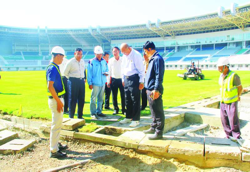 မြန်မာနိုင်ငံအိုလံပစ်ကော်မတီဥက္ကဋ္ဌ အားကစားနှင့်လူငယ်ရေးရာဝန်ကြီးဌာနနှင့် ဟိုတယ်နှင့်ခရီးသွားလာရေးဝန်ကြီးဌာန ပြည်ထောင်စုဝန်ကြီး Jeng Phang နော်တောင်သည် ဒုတိယဝန်ကြီးများဖြစ်ကြသည့် ဦးထိန်လင်း၊ ဦးဇင်မင်းထက်၊ အားကစားနှင့်ကာယပညာဦးစီးဌာန ညွှန်ကြားရေးမှူးချုပ် ဦးဉာဏ်ဇော်ဦး၊ ဒုတိယအမြဲတမ်းအတွင်းဝန်၊ ဒုတိယညွှန်ကြားရေးမှူးချုပ်များနှင့်အတူ ယနေ့နံနက်ပိုင်းတွင် ငလျင်ကြောင့် ထိခိုက်ပျက်စီးခဲ့သည့် ဝဏ္ဏသိဒ္ဓိဘောလုံးကွင်းနှင့် ရေကူးကန် ပြန်လည်ပြုပြင်ဆောင်ရွက်နေမှုအခြေအနေကို လိုက်လံကြည့်ရှုစစ်ဆေးသည်။