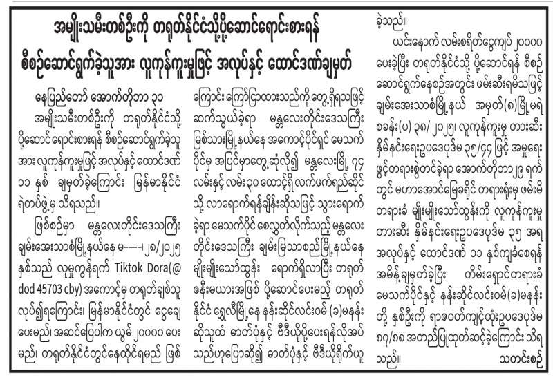 အမျိုးသမီးတစ်ဦးကို တရုတ်နိုင်ငံသို့ ပို့ဆောင်ရောင်းစားရန်စီစဉ်ဆောင်ရွက်ခဲ့သူအား လူကုန်ကူးမှုဖြင့် အလုပ်နှင့်ထောင်ဒဏ်ချမှတ်