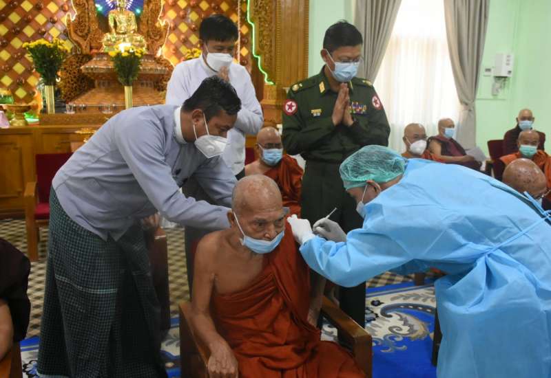 နိုင်ငံတော်သံဃမဟာနာယကအဖွဲ့ဥက္ကဋ္ဌ ဗန်းမော်ကျောင်းတိုက်ဆရာတော်နှင့် ထေရ်ကြီး ဝါကြီးဆရာတော်ကြီးများအား COVID-19 ရောဂါကာကွယ်ဆေး ဒုတိယအကြိမ် ထိုးနှံပေးခြင်း အစီအစဉ်ကို ယနေ့နံနက်ပိုင်း၌ ရန်ကုန်တိုင်းဒေသကြီး မရမ်းကုန်းမြို့နယ် သိရီမင်္ဂလာ ကမ္ဘာ့အေးကုန်းမြေရှိ နိုင်ငံတော်သံဃမဟာနာယက အဖွဲ့ ဘုရားခန်း၌ ပြုလုပ်သည်။