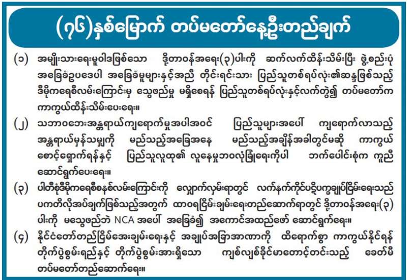 တိုင်းဒေသကြီးနှင့် ပြည်နယ်များရှိ တိုင်းရင်းသား ပြည်သူများ၏ကျန်းမာရေးဆိုင်ရာအခက်အခဲများကို တစ်ထောင့်တစ်နေရာမှ အထောက်အကူပြုစေရန် အတွက် မြို့နယ်အသီးသီးရှိတပ်မတော်ဆေးရုံများနှင့် ယာယီကုသရေးဆေးရုံများတွင် ကျန်းမာရေး စောင့်ရှောက်မှုများကို ဆောင်ရွက်ပေးလျက်ရှိရာ ဖေဖော်ဝါရီ ၅ ရက်မှ ယနေ့အထိ ပြင်ပလူနာ ၇၈၃၂၃ ဦး၊ အတွင်းလူနာ ၄၁၄၈ ဦးကို တပ်မတော်မှ ပါရဂူ များ၊ ဆေးမှူးများ၊ သူနာပြုများဖြင့် ကျန်းမာရေး စစ်ဆေးပေးခြင်း၊ ခွဲစိတ်ရန်လိုအပ်သည့်လူနာများ အား ခွဲစိတ်ပေးခြင်း၊ ဆေးရုံတက်ရောက်ကုသရန် လိုအပ်သောလူနာများကိုဆေးရုံတင်ကာကျန်းမာရေး စောင့်ရှောက်ပေးခြင်းများ ဆောင်ရွက်ပေးသည့် အပြင် ဆေးရုံတက်လူနာများနှင့် လူနာစောင့်များ နေထိုင်စားသောက်ရေး အဆင်ပြေစေရန်အတွက် ကိုပါ စီမံဆောင်ရွက်ပေးသည်။