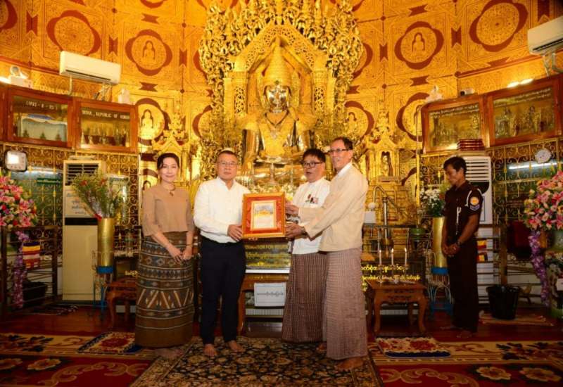 ကာကွယ်ရေးဦးစီးချုပ်(လေ) ဗိုလ်ချုပ်ကြီးထွန်းအောင်၏ ဖိတ်ကြားချက်အရ မြန်မာ-ထိုင်းနှစ်နိုင်ငံလေတပ်များအကြား ချစ်ကြည်ရင်းနှီးမှု ပိုမိုရရှိစေရန်အတွက် Bilateral Engagement Activities ဆိုင်ရာလှုပ်ရှားမှုများဆောင်ရွက်ရန် မြန်မာနိုင်ငံသို့ရောက်ရှိနေသော ထိုင်းဘုရင့်လေတပ်ဦးစီးချုပ် Air Chief Marshal Punpakdee Pattanakul နှင့် ဇနီး ဦးဆောင်သည့် ကိုယ်စားလှယ်အဖွဲ့သည် ယနေ့နံနက်ပိုင်းတွင် ရန်ကုန်မြို့ရှိ ကမ္ဘာအေးဘုရားနှင့် ရွှေတိဂုံစေတီတော်မြတ်ကြီးသို့ သွားရောက်ဖူးမြော်ကြည်ညိုခဲ့ကြပြီး ဗိုလ်ချုပ်အောင်ဆန်းဈေးသို့ သွားရောက်လည်ပတ်ကြည့်ရှုခဲ့ကြသည်။