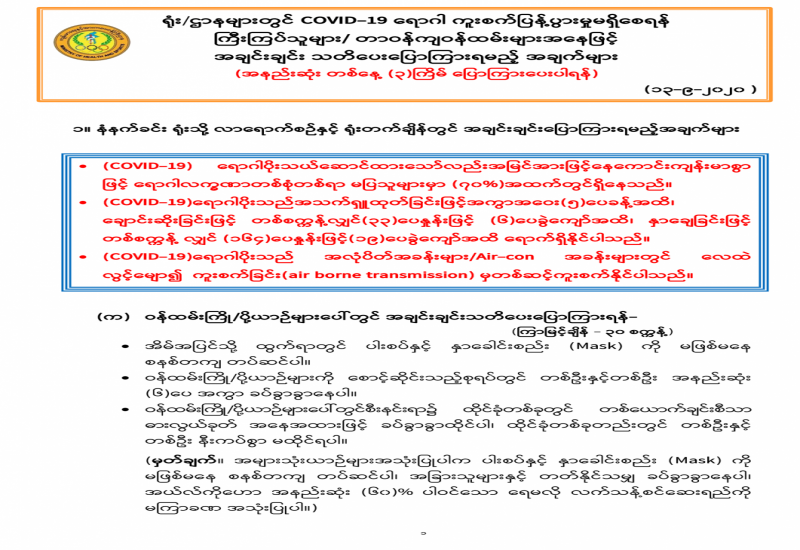 ရုံး/ဌာနများတွင် COVID-19 ရောဂါ ကူးစက်ပြန့်ပွားမှုမရှိစေရန် ကြီးကြပ်သူများ/ တာဝန်ကျဝန်ထမ်းများအနေဖြင့် အချင်းချင်း သတိပေးပြောကြားရမည့် အချက်များ