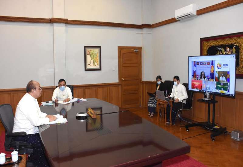 အာဆီယံစီးပွားရေးဝန်ကြီးများနှင့် အာဆီယံစီးပွားရေး အကြံပေးကောင်စီတို့၏ တွေ့ဆုံပွဲကို ယနေ့မွန်းလွဲပိုင်းက ရင်းနှီးမြှုပ်နှံမှုနှင့် နိုင်ငံခြားစီးပွား ဆက်သွယ်ရေးဝန်ကြီးဌာန အစည်းအဝေးခန်းမမှ Video Conferencing စနစ်ဖြင့် ကျင်းပသည်။