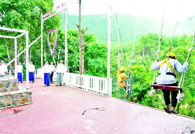 အားကစားနှင့်လူငယ်ရေးရာဝန်ကြီးဌာနနှင့် ဟိုတယ်နှင့်ခရီးသွားလာရေးဝန်ကြီးဌာန ပြည်ထောင်စုဝန်ကြီး Jeng Phang နော်တောင်သည် ဒုတိယဝန်ကြီး ဦးဖြိုးဇော်စိုး၊ ရှမ်းပြည်နယ် စီးပွားရေးရာဝန်ကြီး ဦးခွန်သိန်းမောင်၊ ဌာနဆိုင်ရာတာဝန်ရှိသူများနှင့်အတူ ယနေ့နံနက်ပိုင်းတွင် ကလောမြို့၏ ထင်ရှားသော ခရီးသွားဆွဲဆောင်ရာနေရာတစ်ခုဖြစ်သည့် နန်းသဲကျေးရွာရှိ Kalawe Glamping Adventure Tourism Site ဧရိယာအတွင်းရှိ စွန့်စားခရီးသွားလုပ်ငန်း၊ စခန်းချတည်းခိုနေထိုင်ခြင်းဆိုင်ရာ ခရီးသွားလုပ်ငန်း၊ အပန်းဖြေခရီးသွားလုပ်ငန်း၊ ကြိုးတန်းလျှောစီးလုပ်ငန်းများ အကောင်အထည်ဖော်ဆောင်ရွက်နေမှုကို ကြည့်ရှုစစ်ဆေးသည်။
