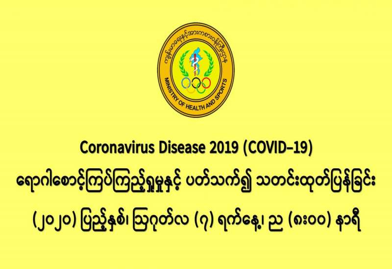 ၁။ (၇-၈-၂၀၂၀) ရက်နေ့အတွက် COVID-19 ရောဂါ ဓာတ်ခွဲစစ်ဆေးရာတွင် - - အမျိုးသားကျန်းမာရေးဓာတ်ခွဲမှုဆိုင်ရာဌာန (ရန်ကုန်) (NHL) မှ (ပထမအသုတ်) ဓာတ်ခွဲ နမူနာ (၃၇၀) ခု၊ - ဆေးသုတေသနဦးစီးဌာန (DMR)မှ ဓာတ်ခွဲနမူနာ (၁၁၁) ခု၊