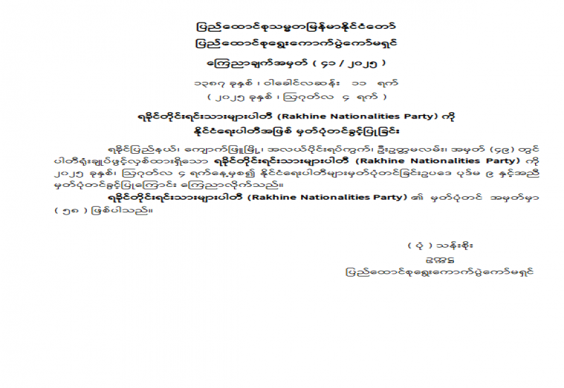 ရခိုင်တိုင်းရင်းသားများပါတီ (Rakhine Nationalities Party) ကို နိုင်ငံရေးပါတီအဖြစ် မှတ်ပုံတင်ခွင့်ပြုခြင်း