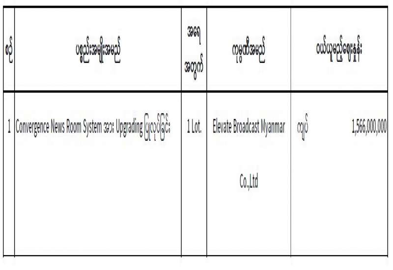 မြန်မာ့အသံနှင့်ရုပ်မြင်သံကြား၏ ၂၀၂၅-၂၀၂၆ ဘဏ္ဍာရေးနှစ်၊ စက်ပစ္စည်းများဝယ်ယူရေးအတွက် (၂၉ - ၇ - ၂၀၂၅) ရက်နေ့တွင် ပြန်ကြားရေးဝန်ကြီးဌာန၊ ပြည်တွင်း/ ပြည်ပပစ္စည်းများ ဝယ်ယူရေးနှင့်ထုခွဲရောင်းချရေးကော်မတီမှ ဈေးနှုန်းစိစစ်ခဲ့ရာ ဖော်ပြပါကုမ္ပဏီမှ ယှဉ်တွဲပါဈေးနှုန်းဖြင့် တင်ဒါအောင်မြင်ကြောင်း ကြေညာအပ်ပါသည် -