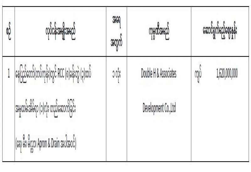 နေပြည်တော် (တပ်ကုန်း) တွင် RCC (၈) ခန်းတွဲ (၃)ထပ် အမှုထမ်းအိမ်ရာ (၁)လုံး တည်ဆောက်ခြင်းအတွက် (၂၉ - ၇ - ၂၀၂၅) ရက်နေ့တွင် ပြန်ကြားရေးဝန်ကြီးဌာန၊ ပြည်တွင်း/ ပြည်ပပစ္စည်းများ ဝယ်ယူရေးနှင့်ထုခွဲရောင်းချရေးကော်မတီမှ ဈေးနှုန်းစိစစ်ခဲ့ရာ ဖော်ပြပါကုမ္ပဏီမှ ယှဉ်တွဲပါဈေးနှုန်းဖြင့် တင်ဒါအောင်မြင်ကြောင်း ကြေညာအပ်ပါသည် -