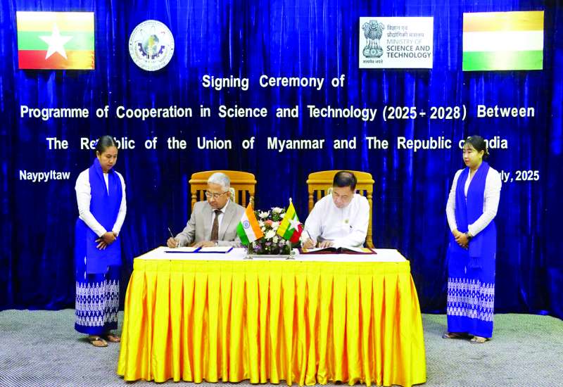 ၂၀၂၅ -၂၀၂၈ ခုနှစ် ကာလအတွက် ပြည်ထောင်စုသမ္မတ မြန်မာနိုင်ငံတော်နှင့် အိန္ဒိယသမ္မတနိုင်ငံတို့အကြား သိပ္ပံနှင့်နည်းပညာ ပူးပေါင်းဆောင်ရွက်မှုအစီအစဉ်- Programme of Cooperation (POC) in Science and Technology လက်မှတ်ရေးထိုးပွဲကို ယနေ့နံနက်ပိုင်းတွင် ရုံးအမှတ် (၂၁) သိပ္ပံနှင့် နည်းပညာဝန်ကြီးဌာန အစည်းအဝေးခန်းမ၌ ကျင်းပသည်။