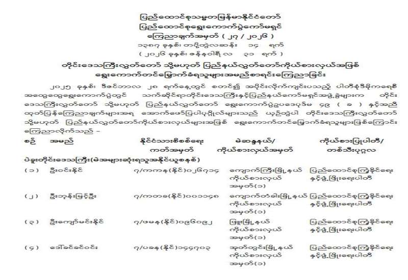 တိုင်းဒေသကြီးလွှတ်တော် သို့မဟုတ် ပြည်နယ်လွှတ်တော်ကိုယ်စားလှယ်အဖြစ် ရွေးကောက်တင်မြှောက်ခံရသူများ အမည်စာရင်းကြေညာခြင်း